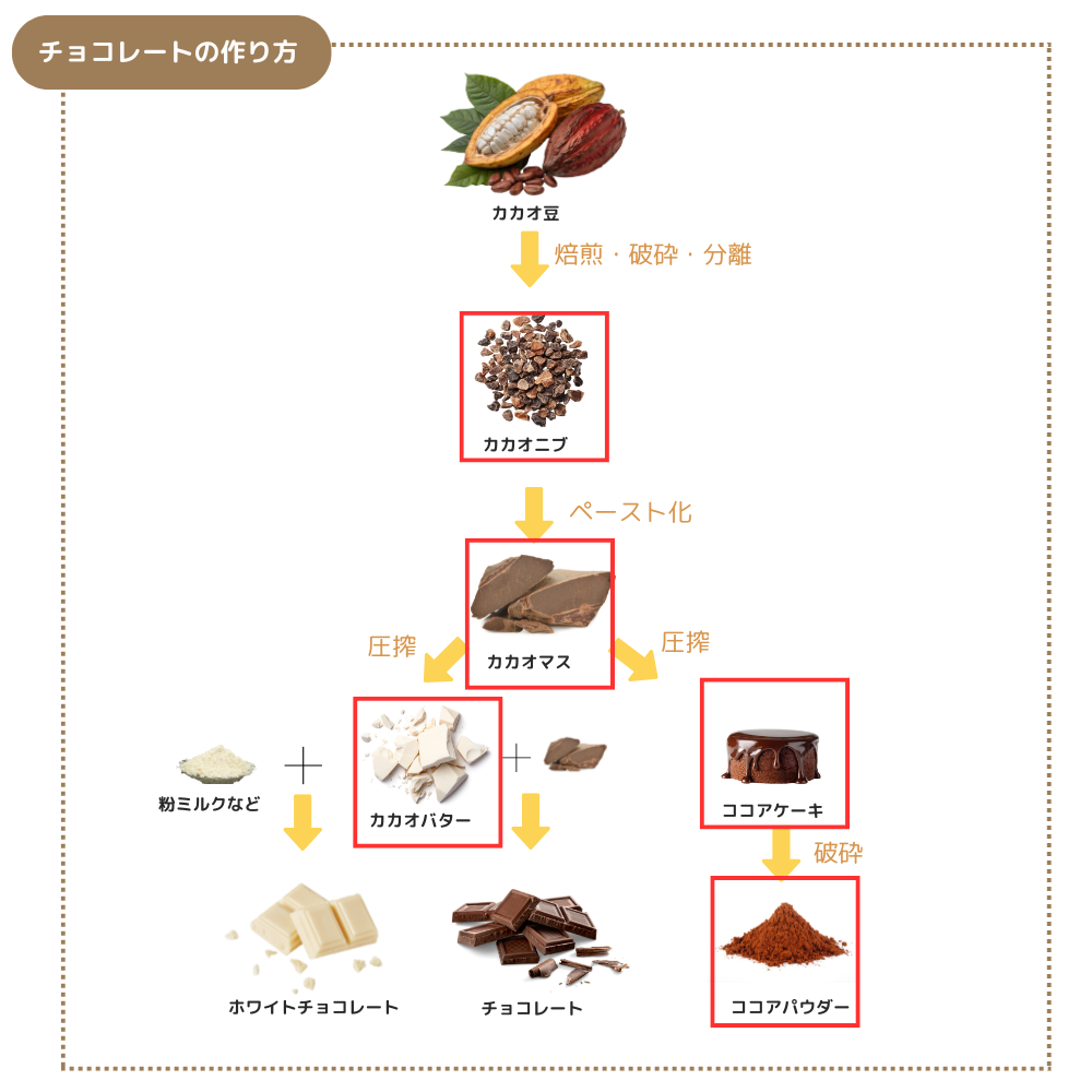 収穫後に発酵・乾燥させたカカオ豆を焙煎し、殻を取り除いた後、砕いて、すり潰して、分離してペースト状のカカオマスにした後に、砂糖や牛乳を加えて練ります。